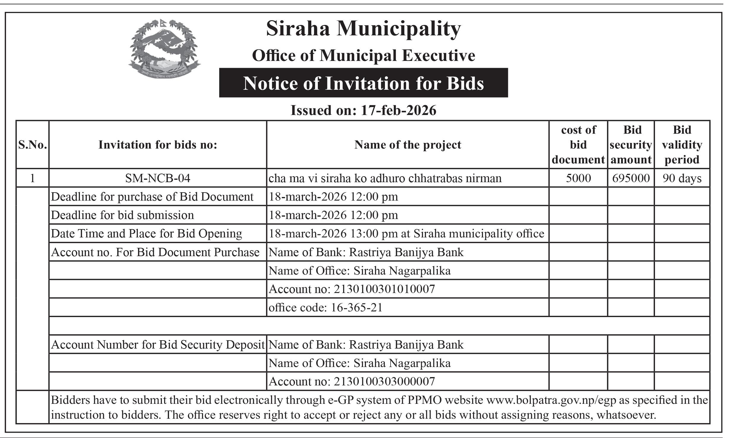 च.मा.वि.सिरहाको अधुरो छात्रावास निर्माण सम्बन्धी ठेक्काको सूचना