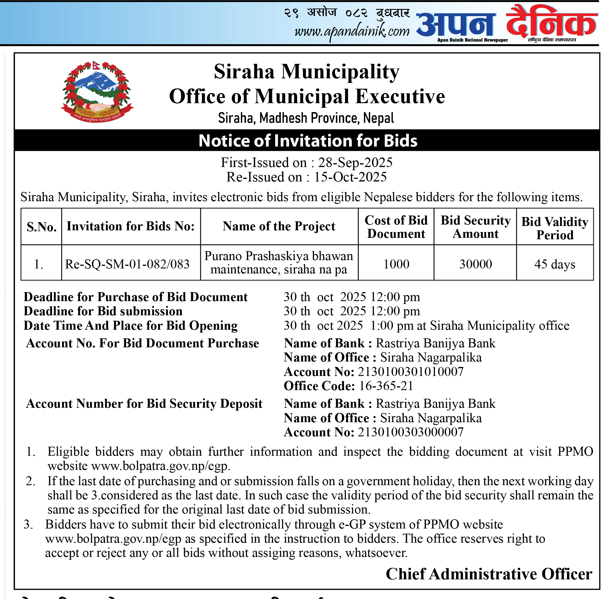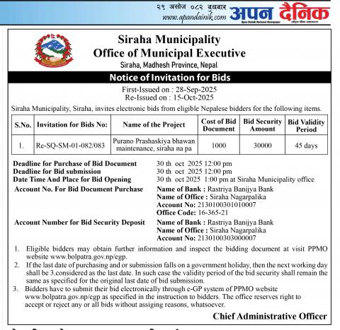 » पुरानो प्रशासकीय भवन मर्मत सम्भार गर्ने सम्बन्धी बोलपत्र आह्वानको सूचना
